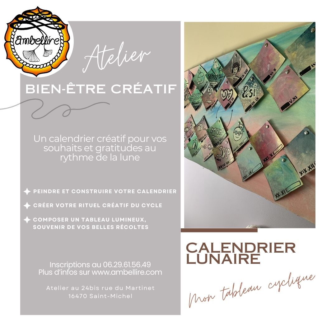 Dans cet atelier de calendrier lunaire, vous réalisez une grande œuvre colorée où chaque pleine lune et chaque nouvelle lune de 2026 prend sa place. Peinture, collage et assemblage vous permettent de concevoir un tableau vivant qui deviendra votre compagnon tout au long de l’année.